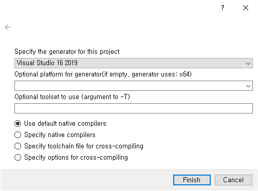 Configure를 눌러서 VS 2019 로 설정하자. 기본으로 되어있다. platform 이나 기타도 그냥 기본값으로 두었다.