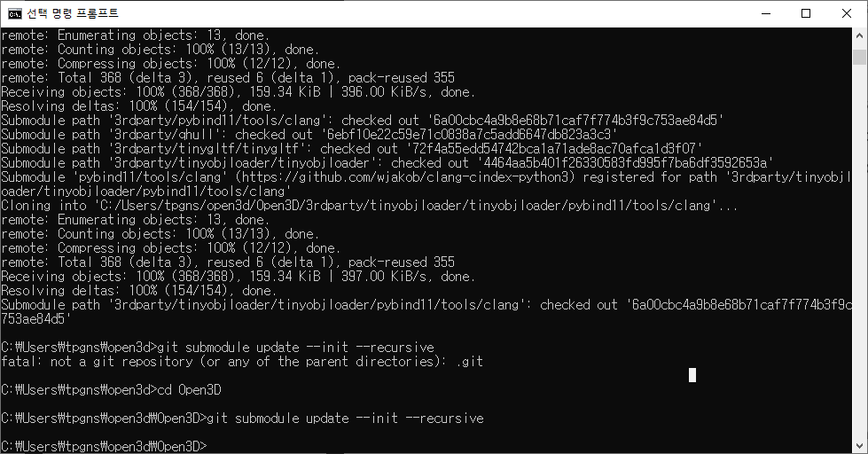 다음과 같이 clone 이 완료되었으면, 3rd party 를 위한 서브모듈 업데이트를 진행해야한다.