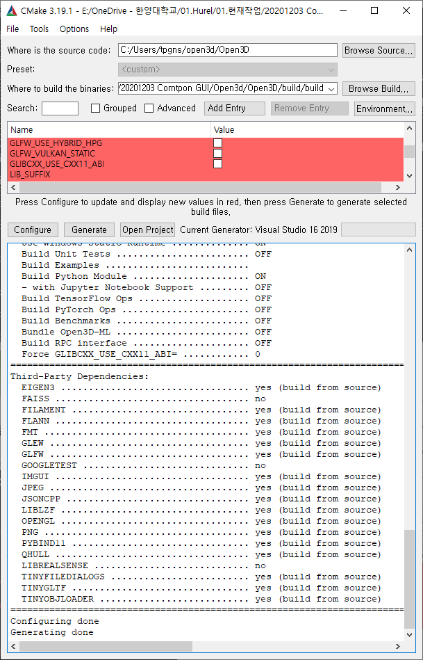 Finish를 누르면 Configure 이 완료되고, Generate 를 누르면 build 폴더 안에 Open3D.sln 파일이 생성된다.