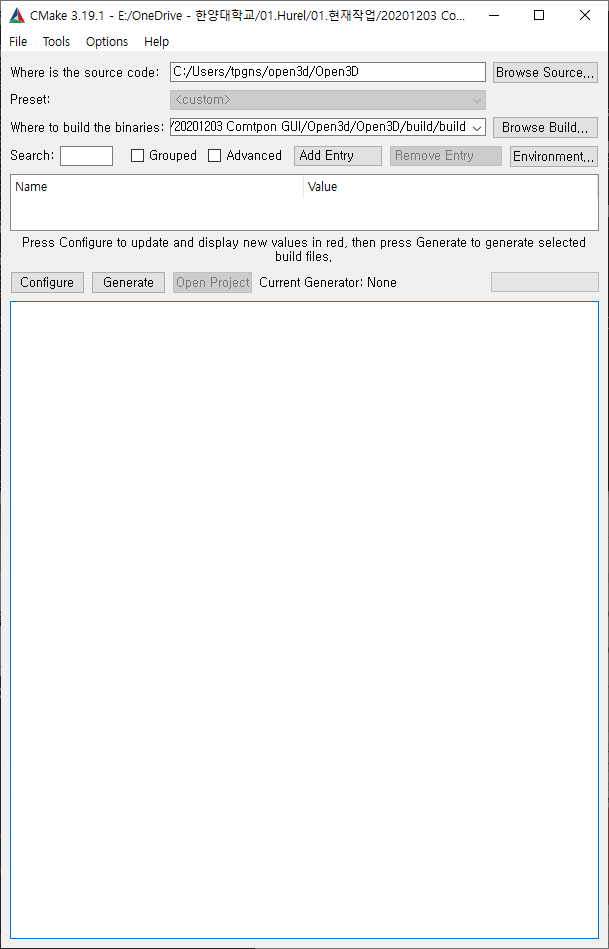 Browse Build 를 눌러 Open3D를 빌드할 폴더를 설정하자. 필자는 Open3D/build 폴더로 설정하였다.