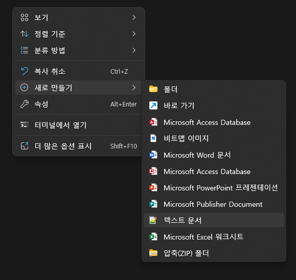 폴더 내에서 오른쪽 클릭> 새로 만들기>텍트스 문서를 만듭니다.