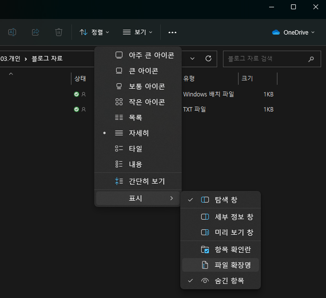 폴더 창 윗부분에 보기>표시>파일 확장자명 체크를 합니다.
