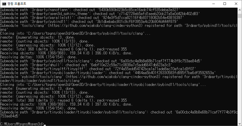 윈도우 운영체제에서 Open3d를 C++로 활용하려면 직접 소스에서 빌드를 해, Visual studio를 위한 솔루션을 만들어야한다. 일단, Git 하고 cmake-gui를 설치하자. 참고로 open3d 버전과 vs 버전은 어느정도 일치가 되어야한다. 여기서 진행한 기준은 opend3d 0.11 + vs 2019+ 이다. 추가로 설치해야 할 것이 많다. open3d 버전에 알맞는 파이썬이 필요하다. 이 글에서는 python 3.7을 이용하였다. 일단, open3d를 깃헙에서 가져오자. cmd 창에서 원하는 폴더로 이동후 다음과 같은 명령어를 친다. git clone --recursive https://github.com/intel-isl/Open3D 다음과 같이 clone 이 완료되었으면, 3rd pa..